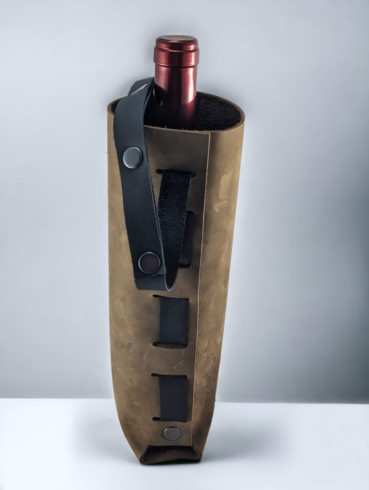 Sac lacé en cuir pour transport d'une bouteille de vin, avec courroie et rivets noirs